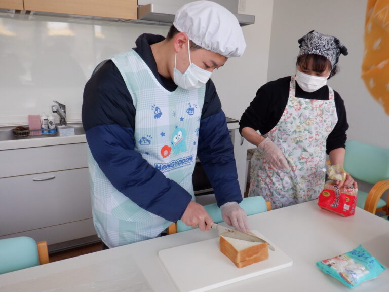 ひびきはばたき園の自立訓練(生活訓練)は、就職し働きながら生活を送ることを目指したときに、必要な力(知識や技術など)や心を育てるためにたくさんのカリキュラムを用意しています。2年間の中で経験したことを通して、次の進路に向けた選択肢を自分で選び、進んでいけるように寄り添いながらサポートしています。