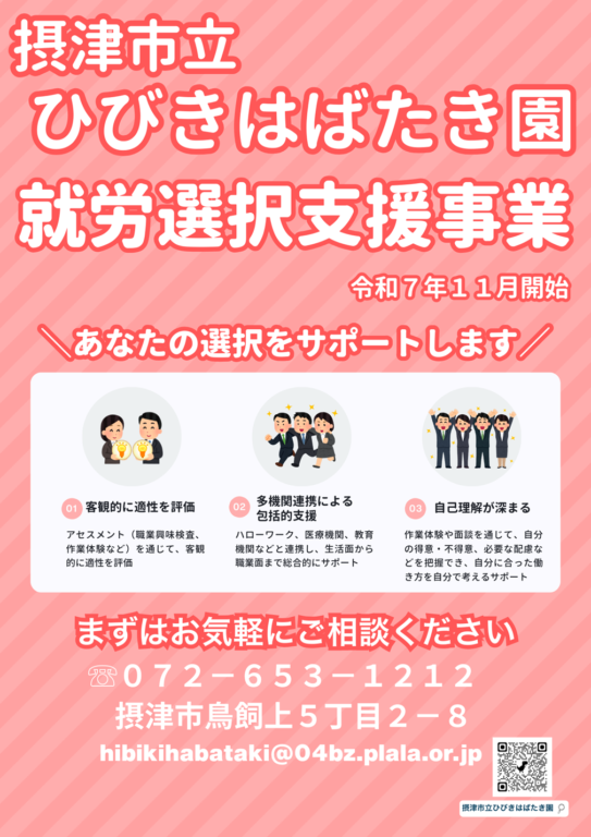 11月から、ひびきはばたき園では、新しく就労選択支援事業が始まりました。 このサービスは新しく就労継続支援B型を利用したいと思っている方や、今の自分はどんな事が得意なんだろう?どんなお仕事が自分にむいているかな?と悩んでいる方に対して、面談での話し合いや、 実際に作業に取り組んでもらっての様子をみながら一緒に将来について考えサポートするサービスになります。ひびきはばたき園の就労支援サービスってどんな所か気になった方はいつでも見学できますので、お気軽におたずねください😊