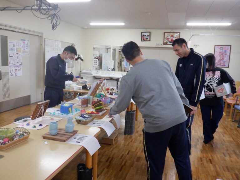 先日、ひびきはばたき園ではお披露目会を行いました。作品展当日に飾るレイアウトを作品担当の職員が一人ひとりのご利用者さんの個性が光るように考えて、飾り付けを行いました。すべての作品を飾り終わって園長にチェックしてもらい、チェックが無事終わると、ご利用者さんにもそれぞれの作品をお披露目して、一足先に作品展の気分を味わってもらいました。作品展開催まであと少しです‼