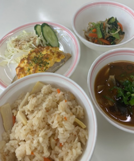 献立は、「たけのこご飯・鰆の菜種焼き・小松菜のごま和え・豆腐の赤だし」です。